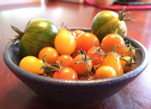 We have been growing three different types this year -- some tiny orange cherry tomatoes, some yellow pear tomatoes and some green zebra stripe heirlooms. The small size is key, as we are growing them in pots in our not-at-all-large patio.